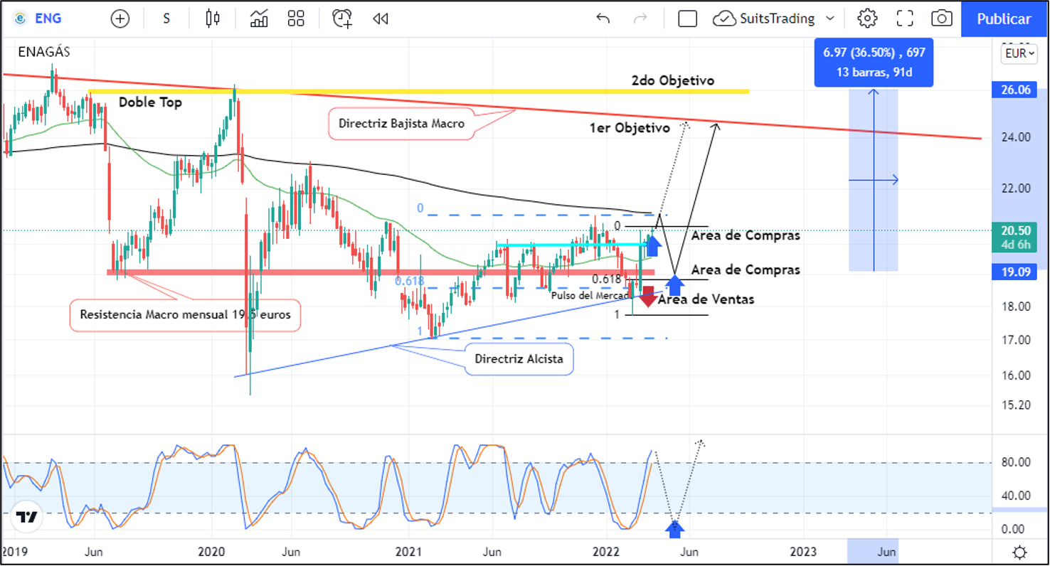 Aunque el punto de partida fundamental proviene claramente del miedo por la escasez del suministro de gas proveniente de Rusia, el punto de partida técnico se soporta en la directriz alcista confirmada que se crea desde marzo de 2020 cuando la acción de Enagás creo mínimos abajo de los 15 euros por la llegada de la pandemia.