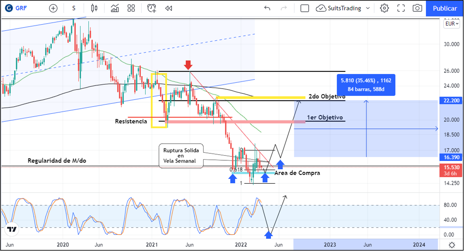 Su tendencia bajista es innegable y la ruptura que el precio realizó del canal alcista macro en febrero del año pasado, fue la clara confirmación de las abruptas caídas que sucedieron hasta hoy. Financieramente Grifols tiene un problema que corresponde al valor de su deuda con lo cual, al mismo tiempo, es una de las compañías que más ha incrementado los seguros de impago lo que la pone nuevamente en riesgo de reducción de calificación crediticia en el corto y mediano plazo haciendo más difícil una recuperación futura.