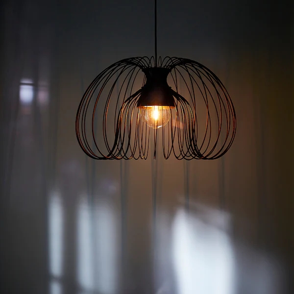 Una pantalla muy ligera, con aspecto atemporal, con portalámparas para elegir la bombilla que prefieras. La estructura está hecha en alambres de metal, creando una interesante combinación de sombras y luces en las paredes de la habitación.