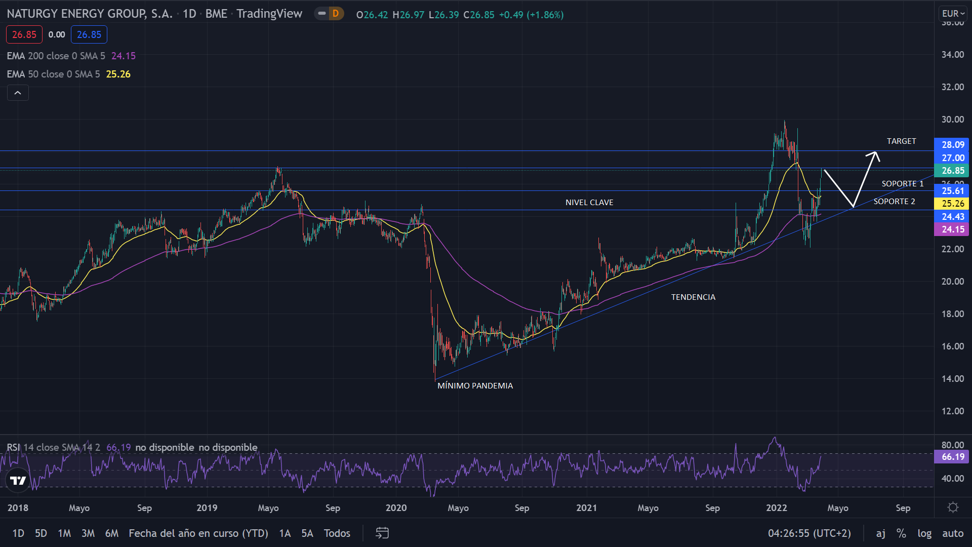 A nivel técnico, desde el mínimo marcado por la pandemia, Naturgy se ha movido en tendencia alcista, alcanzando los 30 euros. Tras anunciar su división en dos grupos, sus acciones cayeron hasta los 22 euros. Actualmente el precio se sitúa nuevamente dentro de la tendencia alcista. La proyección para el corto plazo es bajista, llevando el precio a corregir hasta los 24,50 euros, siendo este el nivel el anterior a la pandemia. La proyección para el medio plazo es alcista, continuando con la tendencia alcista, con los 28 euros como objetivo.