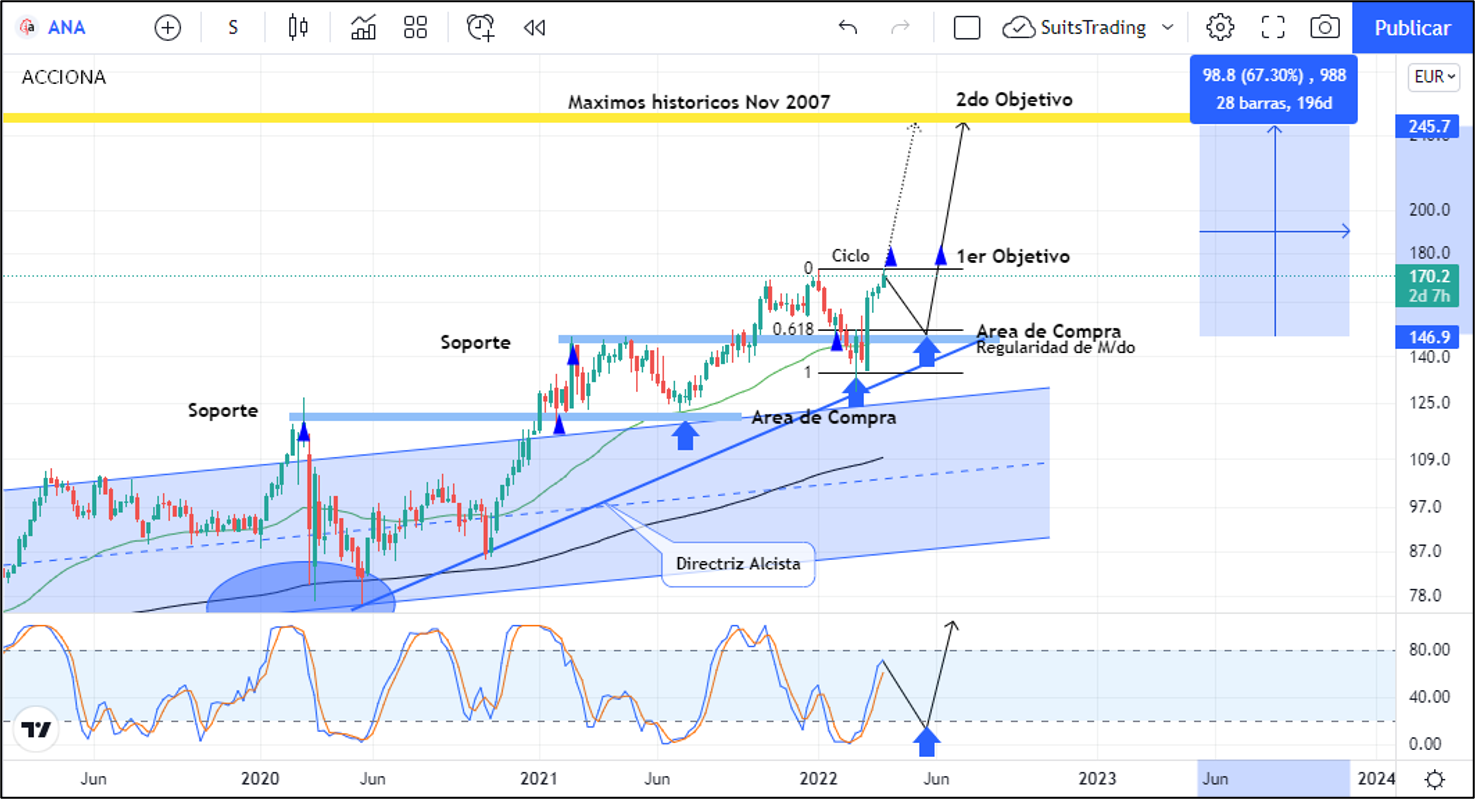 Este movimiento ya lo teníamos marcado desde el pasado 2 de noviembre y lo compartimos en el artículo denominado «Acciona prospecta subidas de más del 60% al precio de la acción»; análisis sobre gráfico de marco mensual que ha desarrollado una divergencia entre el movimiento alcista del precio y las caídas del índice de fuerza relativa lo cual indica un probable movimiento a la baja de la acción en el corto plazo que estaría de acuerdo a la hipótesis del cierre de ciclo y su posterior pullback a áreas de regularidad.
