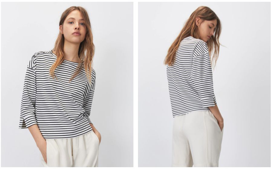 No puede faltar para la primavera una propuesta tan marinera o marítima como esta camiseta a rayas con botones en hombro y manga semilarga. Tiene cuello de caja y está hecha en poliéster y sobre todo viscosa. Se vende en El Corte Inglés en azul marino y a un precio de 19,99 euros. Una opción ideal para lucir también en verano, sobre todo en tus vacaciones y escapadas al mar. Irás a la última y desearás montarte en un barco. En este enlace la puedes comprar.