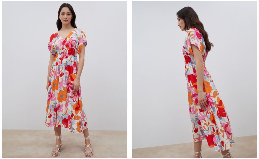 Volvemos a un rango de precio inferior, por debajo de los 50 euros de nuevo, y volvemos con Fórmula Joven, con este otro modelo midi con escote de pico, en estampado y manga corta. Está hecho 1005 en viscosa y como ves es un estampado floral típico, que nunca pasa de moda, con esa diferencia de altura elegante en el bajo de la falda. Es perfecto para llevar con sandalias. Lo tienes aquí en multicolor y lo podrás llevar en cualquier situación. Su precio exacto es de 49,99 euros.