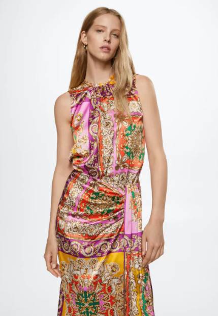 En Mango no te va a costar encontrar prendas satinadas esta temporada. Aquí te traemos otros ejemplos. Se trata de un bonito y original diseño de cuello cerrado y sin mangas. De corte recto.