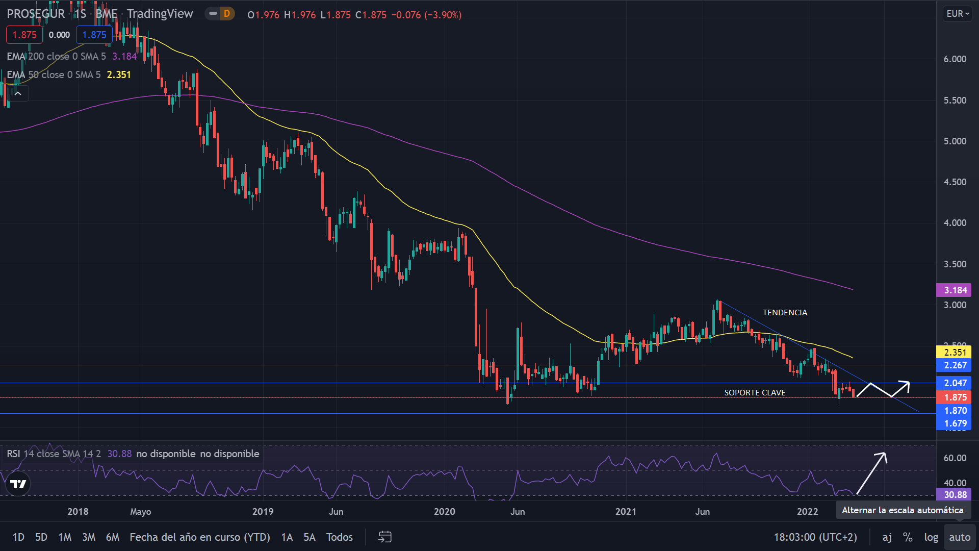A nivel técnico, Prosegur se encuentra en una tendencia bajista desde junio de 2021. Actualmente el precio se sitúa en el soporte clave de los 1,87 euros, siendo este el mínimo marcado por la pandemia. La proyección para el medio año es lateral, manteniendo el precio por encima de dicho soporte, saliendo así de la tendencia bajista.