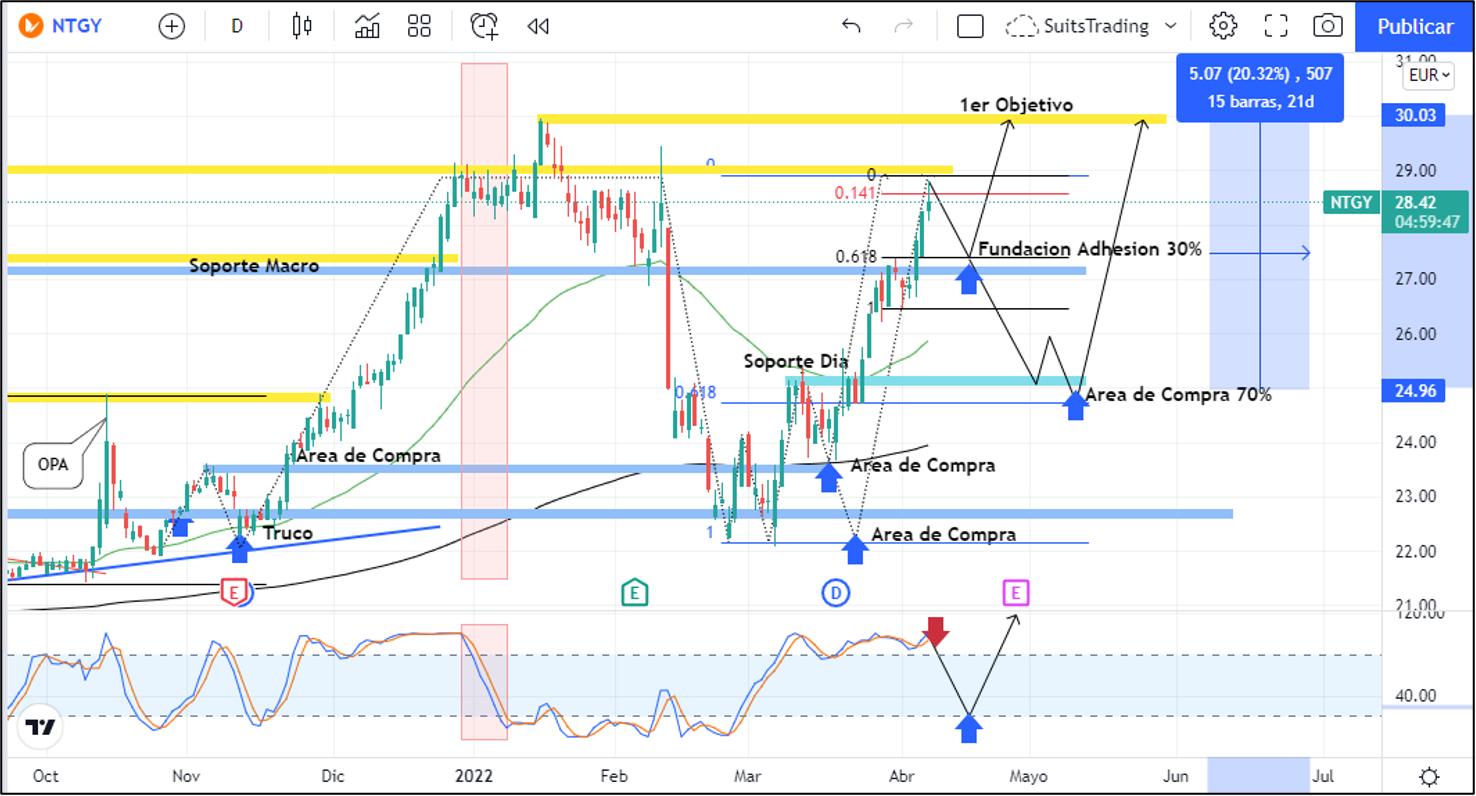 En este orden de ideas, realizaremos fundación de compra sobre el primer soporte en inmediaciones de 27 euros lo que corresponde a no más de un 30% del total de riesgo de manera tal que, si ejerce mayor presión a la baja, podamos adherir el restante 70% de riesgo en los 25 euros por acción en busca de un primer objetivo en los máximos anuales registrados el 17 de enero arriba de los 29,9 euros y muy seguramente un segundo objetivo en sus máximos históricos arriba de los 38 euros, para lo cual haremos una próxima actualización. Esta operación reflejaría entre el 20% y 50% de beneficio adicional estimado a un mediano y largo plazo.