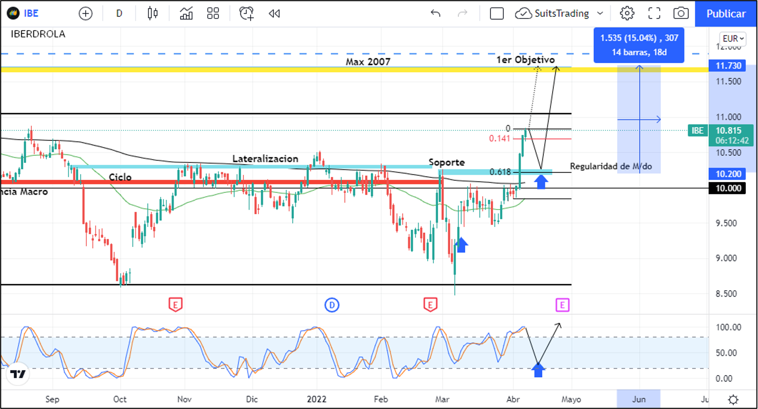 Las acciones de Iberdrola suben cerca de un 8,53% en lo corrido de la semana impulsando al mismo tiempo el movimiento alcista del Ibex 35 que acumula cerca del 1%. Desde el pasado 24 de febrero venimos siguiendo el precio de la acción de la compañía cuando se encontraba en área de decisión de regularidad del mercado en niveles de 9,25 euros la cual, pretendía realizar un primer movimiento a la baja con objetivo en 8,6 euros que cumplió el 7 de marzo para posteriormente desarrollar un movimiento alcista que a hoy, suma más de un 25% de revalorización cumpliendo el objetivo que teníamos trazado en las compras en inmediaciones de 10,28 euros correspondiente al cierre de ciclo creado entre septiembre y noviembre de 2021.