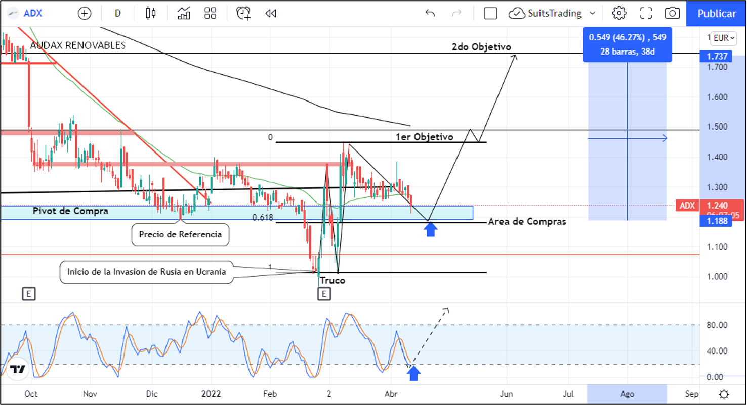 Debido a la guerra de Rusia, el precio desarrolló una formación de truco con su posterior nuevo máximo el cual, al desarrollar retrocesos de manera más lenta que la subida que lo antecede en áreas de regularidad del mercado en el 61,8 de retroceso de Fibonacci en 1,18 euros que confluye con precios de referencia mínimos creados por la pandemia, indican el área de compra como punto de giro alcista el cual irá a buscar un primer objetivo en los máximos de marzo en inmediaciones de 1,44 euros y un segundo objetivo en el pulso del mercado del cierre de ciclo de la estructura macro mensual en inmediaciones de 1,75 euros.