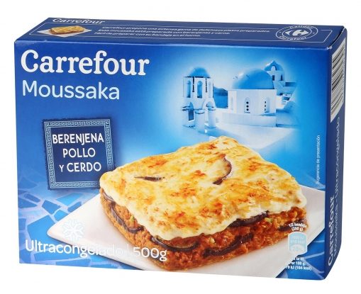 El siguiente producto de Carrefour es este plato moussaka o mussaka. Este plato es de origen griego y está hecho con berenjena y carne picada de pollo y cerdo. De nuevo, es un plato bastante laborioso de preparar, pero tenemos la opción precocinada que es casi igual.