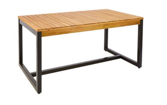 Non encanta esta mesa que hemos visto en el catálogo de Alcampo. Y todo porque, al estar fabricada a base de madera de acacia tiene la capacidad de dar un toque muy cálido a tu jardín o a tu balcón. Además tiene patas de acero, por lo que es muy robusta. Tiene capacidad para hasta 8 personas y un espacio para colocar una sombrilla. Cuesta 319’90 euros.