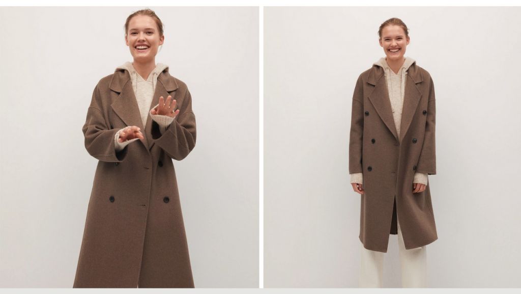 Mango tiene este abrigo largo de lana que se puede encontrar en varias tallas y dos colores. Uno es el marrón medio, como el de la imagen, y el otro color disponible es el gris claro/pastel.
