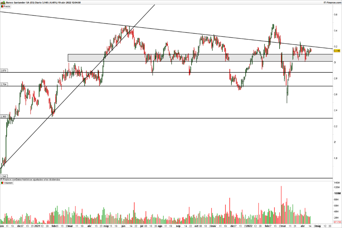 Banco Santander, por su parte, abonará un total de 865 millones de euros el próximo dos de mayo, a razón de 0,052 euros por acción. La rentabilidad de este montante es del 1,64%. La entidad presidida por Ana Botín tiene la intención de abonar el 40% de su beneficio a sus accionistas y este pago corresponde al 50% del total. La entidad financiera presenta un soporte en los 3 euros por acción, mientras tiene ante sí las barreras de los 3,2 y 3,3 euros.