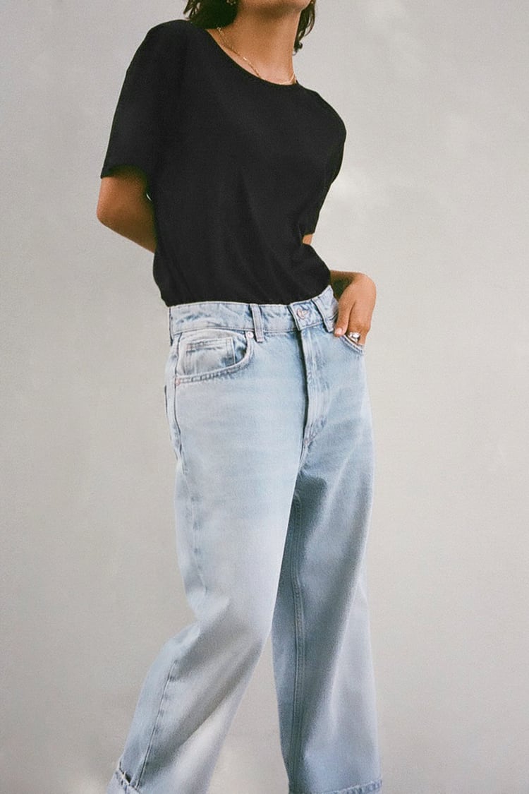 Esta de cuello redondo con bajo asimétrico te puede ayudar a crear infinidad de estilismos. Y lo mejor es que la tienes disponible en una amplia variedad de colores y por solo 6,95 euros la unidad.