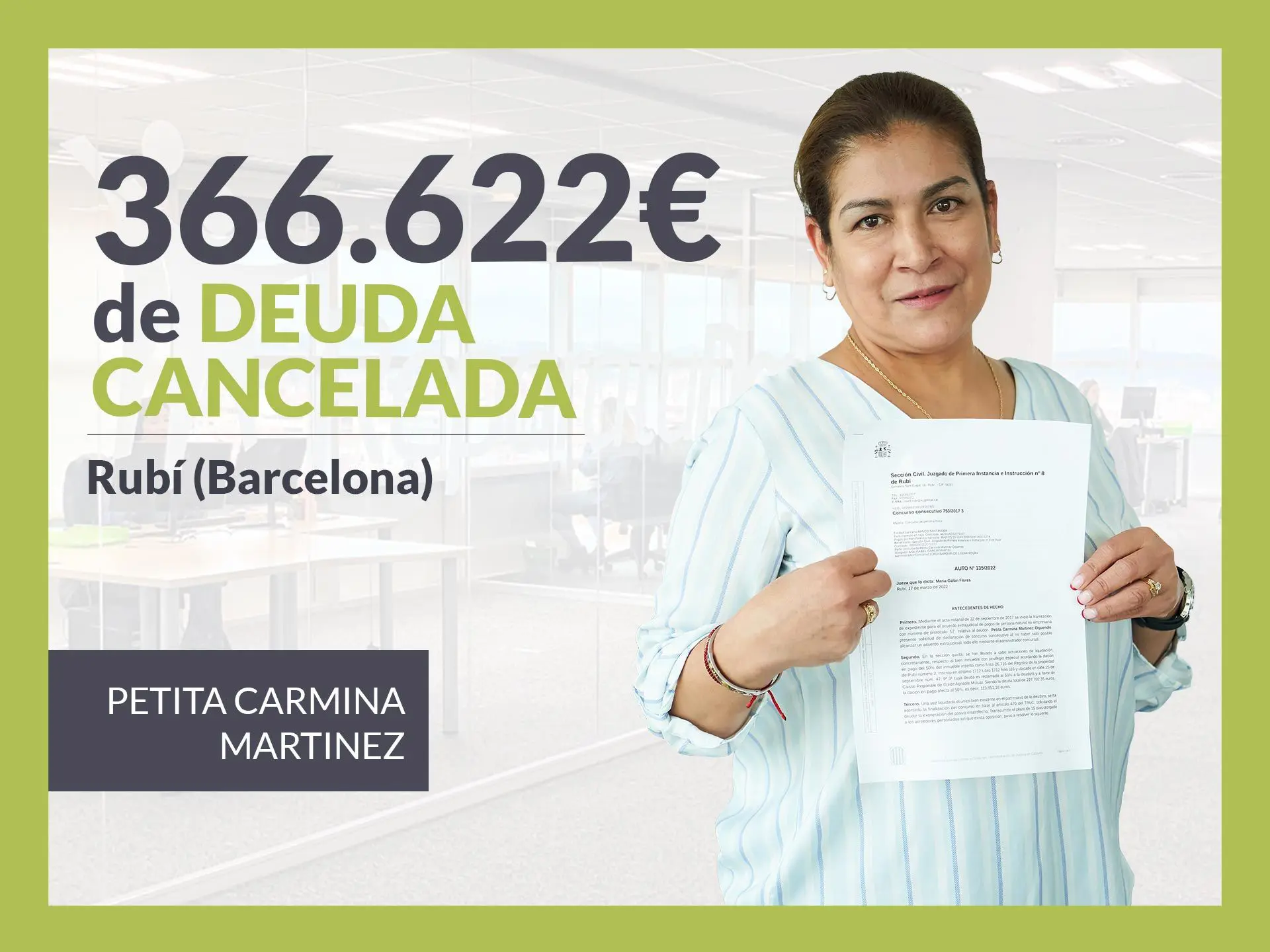 Repara tu Deuda, despacho de abogados líder en España en la Ley de Segunda Oportunidad, ha logrado otra cancelación de deuda mediante la Ley de Segunda Oportunidad. Se trata del caso de Petita Carmina Martínez, vecina de Rubí (Barcelona), casada. El Juzgado de Primera Instancia nº8 de Rubí (Barcelona) ha concedido el Beneficio de Exoneración del Pasivo Insatisfecho (BEPI), liberándole de una deuda que ascendía a 366.622 euros. VER SENTENCIA