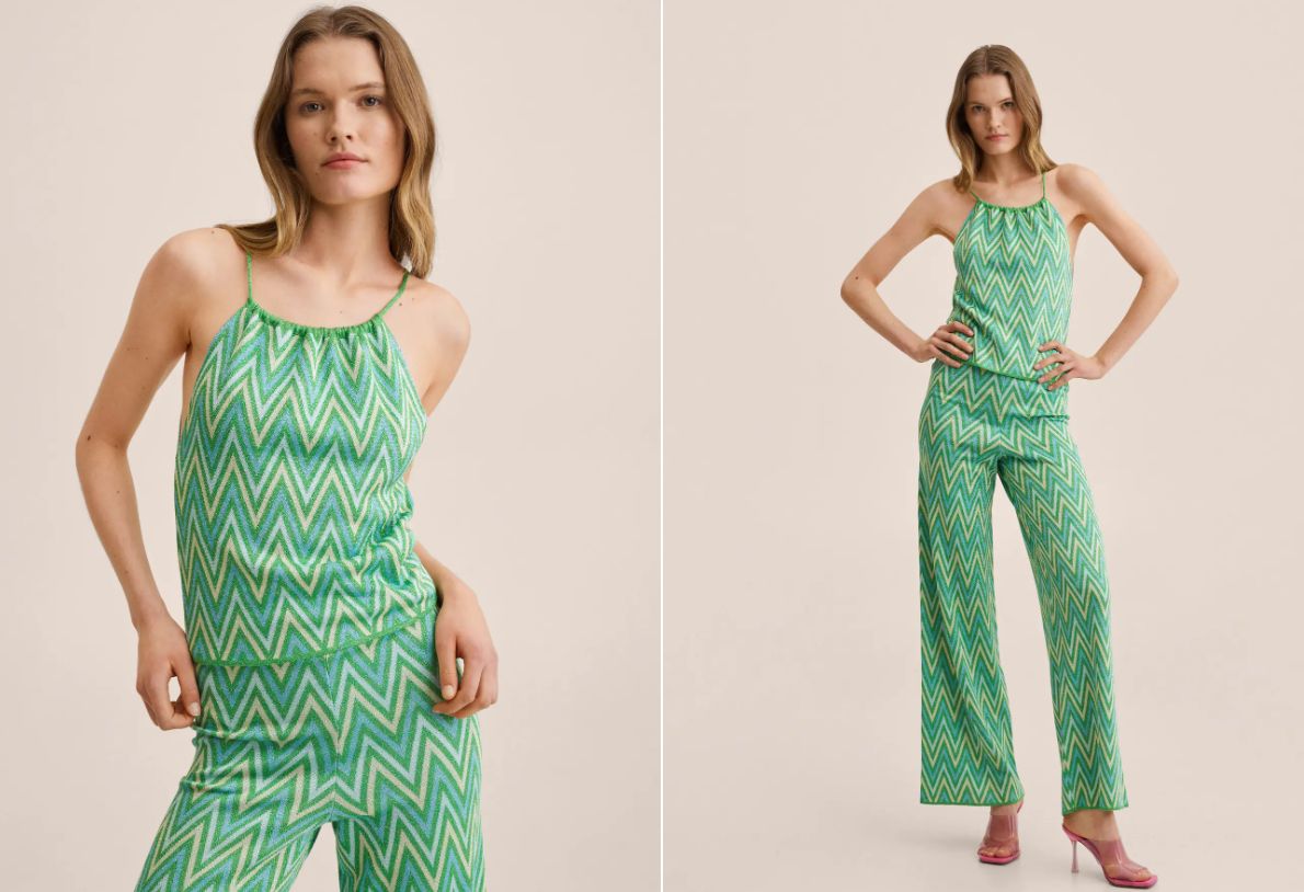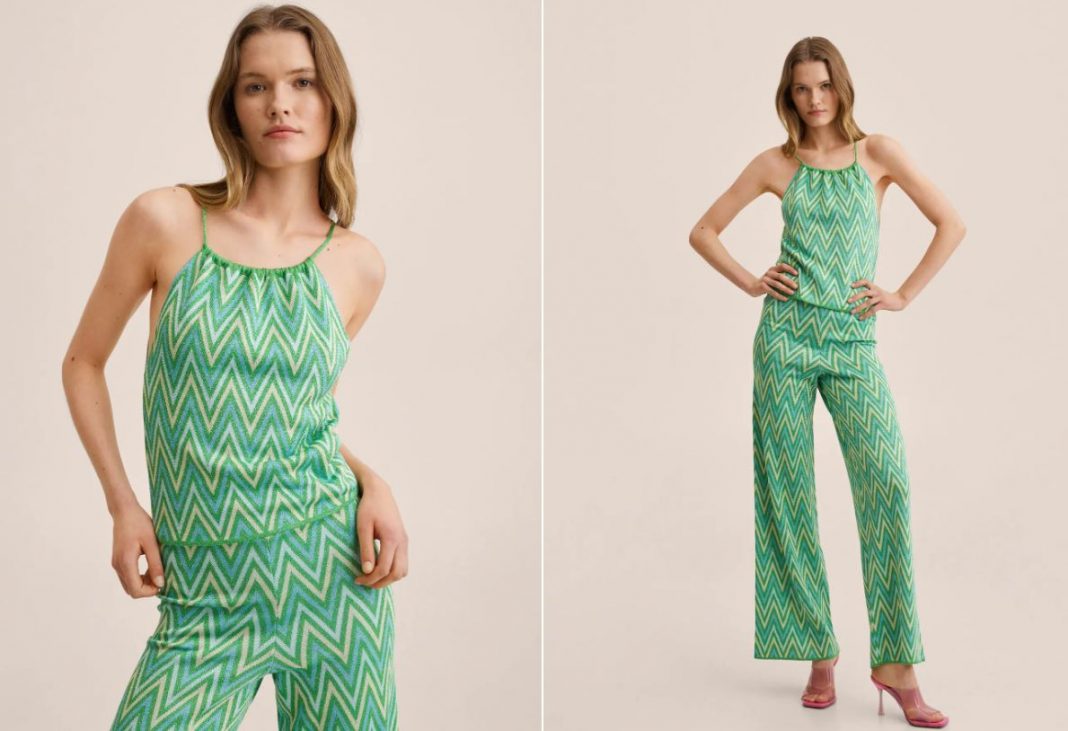 Veamos un diseño muy primaveral, con su estampado retro y colorido, y a un precio fantástico de 19,99 euros. Se trata de este top crop en punto fino, con tejido de lúrex, diseño recto, cuello halter, sin mangas y con cierre de lazo en el cuello. Como ves tiene pantalón a juego pero combina muy bien con una falda corta o larga y unos vaqueros. Está hecha en un 50% en poliéster y el resto en viscosa.