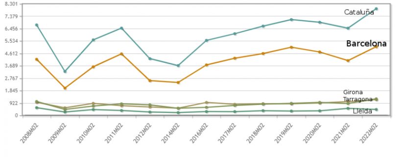 Es un dato que da luz sobre la evolución en el mercado inmobiliario, pero las cifras en Cataluña dan pie al temor a una nueva burbuja. En concreto, la compraventa de viviendas en febrero de 2022 supera en un 17% a las del mismo mes de 2008 en Cataluña. En Barcelona, la subida es del 22%, mientras se mantienen prácticamente invariables en el resto de provincias respecto al mismo mes de hace catorce años.