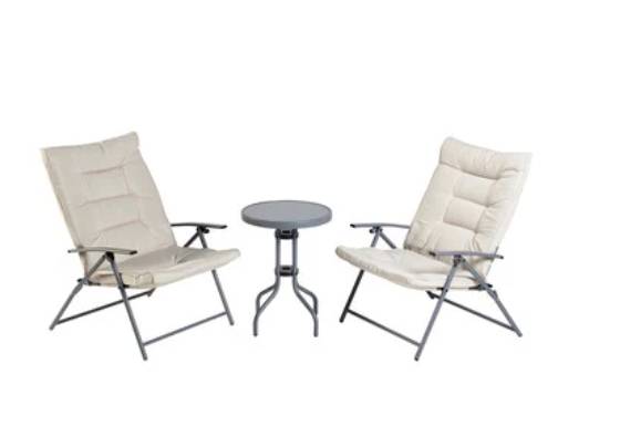 Incluye una práctica y pequeña mesa redonda de cristal de 60 cm de diámetro y dos sillones plegables con cuerpo de color gris y cojines en tonos crema. Un conjunto perfecto para convertir tu balcón en un oasis para el descanso.