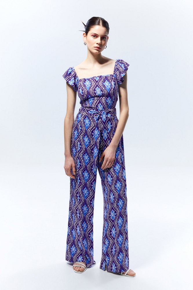 Un pantalón que lo tiene todo para convertirse en uno de tus favoritos de esta temporada. Se ajusta en la cintura mediante cinturón del mismo tejido y con el mismo estampado. De tiro alto y con pernera ancha.