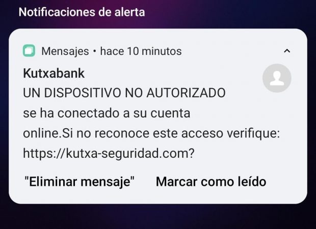 Los ladrones no descansan en su afán de desplumar a los usuarios y conseguir información para continuar sus fechorías. El último ejemplo de esta circunstancia es Kutxabank. MERCA2 ha podido comprobar cómo se están lanzando ataques mediante mensaje de texto para que la persona atacada se conecte y verifique su acceso. Se trata de una trampa que no tiene otro objetivo que conseguir las claves para ingresar en Kutxabank. Lo curioso del caso es muchos de estos ataques se han llevado a cabo contra usuarios de banca que no son clientes de Kutxabank. «Notificación de alerta… Un dispositivo no autorizado se ha conectado a su cuenta online. Si no reconoce este acceso verifique. https://kutxa-seguridad.com”, se lee en el mensaje de texto enviado a un teléfono móvil de una persona que no es cliente de Kutxabank.
