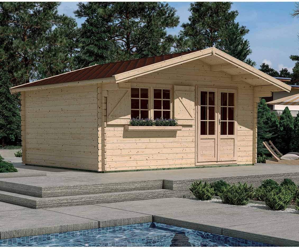 Este modelo es uno de los que más ventas acumulan en Amazon, ya que tiene una estética de clásica cabaña de madera que resulta muy atractivo. Tiene unas dimensiones de 498x398x277cm, casi 20 m2.