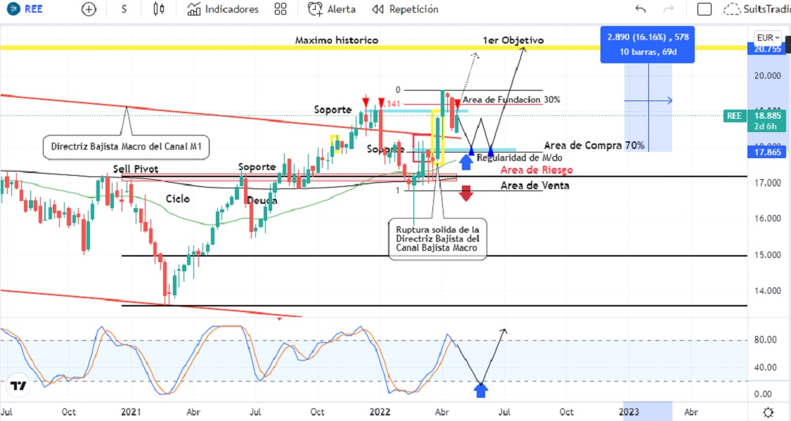 Sin embargo, tal y como lo comentamos en el artículo del pasado 21 de abril, el gráfico de marco semanal nos daba oportunidad de compra como fundación con un 30% del total de inversión en riesgo, pero con la posibilidad de un mayor retroceso en áreas de regularidad en inmediaciones de los 17,8 euros que confluye con el soporte de febrero y marzo de 2022. El índice de fuerza relativa de gráfico semanal se encuentra en niveles de punto de giro lo cual presionaría el precio a la baja dándonos oportunidad de compra en los 17,8 euros en busca de un primer objetivo en su máximo histórico arriba de los 20 euros, lo que representa cerca de un 16% de beneficio estimado al mediano plazo.