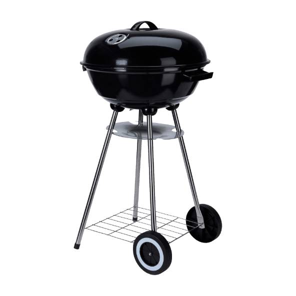 Este modelo redondo tiene un diámetro de parrilla de 46 cm y una altura de 78 cm. Incluye tapa y ruedas, así como dos bandejas, una en la parte superior y otra en la inferior, para que tengas a mano lo que necesitas mientras cocinas.