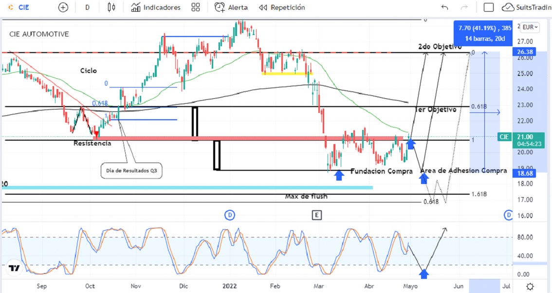 Técnicamente venimos siguiendo la acción de CIE con especial detalle desde marzo cuando, después de la fuerte caída pronosticada por la estructura técnica y psicológica de la acción en gráfico de marco diario, sabíamos de los probables puntos de giro al alza, desde donde hemos comenzado a realizar fundación de compra. Esto significa posiciones con no más de un 30% de inversión del total para este activo.
