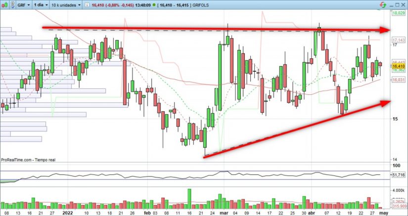 A nivel técnico, Grifols ha dibujado un triángulo recto, con mínimos crecientes. La figura en sí suele ser alcista, pero tiene que tener una confirmación. En este caso, los analistas consultados por MERCA2 apuntan a la ruptura del nivel de los 17,5 euros, clave para aspirar a cotas más elevadas. Por el momento, Grifols se sitúa en zonas no vistas desde octubre de 2014. Y pierde en el año un 4,4%, principalmente por la caída de este viernes.