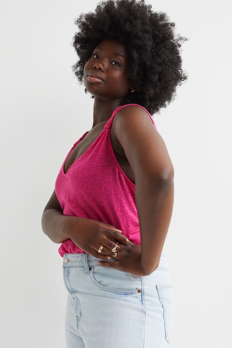 Cuando suben las temperaturas, no hay nada más recomendable que usas prendas frescas y ligeras. El lino se convierte entonces en uno de los textiles más utilizados. Aquí lo tienes en una bonita camiseta de tirantes.