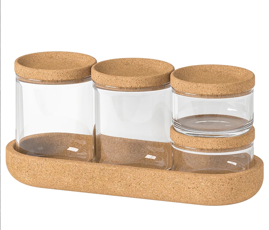 Otra fantástica idea para decorar tu hogar que te trae Ikea es este juego de botes de vidrio, con tapa y bandeja de corcho. Un detalle muy «cuqui» para tu hogar y que solo te saldrá por 10€.