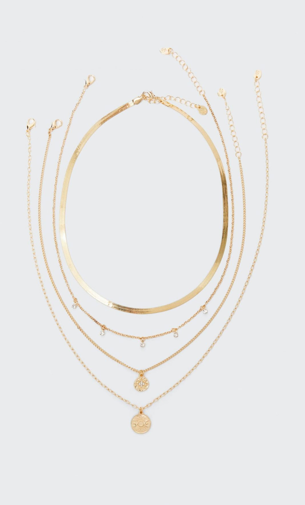 Ni uno, ni dos, ni tres, este set de Stradivarius está compuesto por cuatro collares de diferente estilo y te sale por solo 7,99 euros. En un bonito color dorado que brilla como si se tratara de oro auténtico.