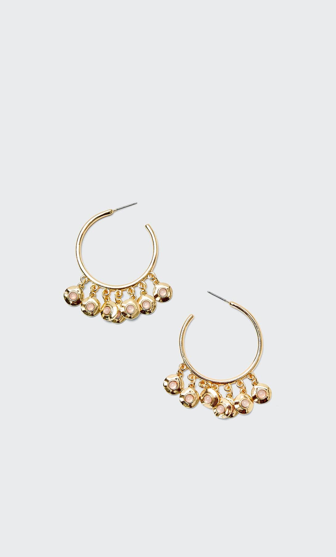 Un par de aros de color dorado de los que cuelgan unos originales círculos que tienen en su interior una “perla” de color rosa.
