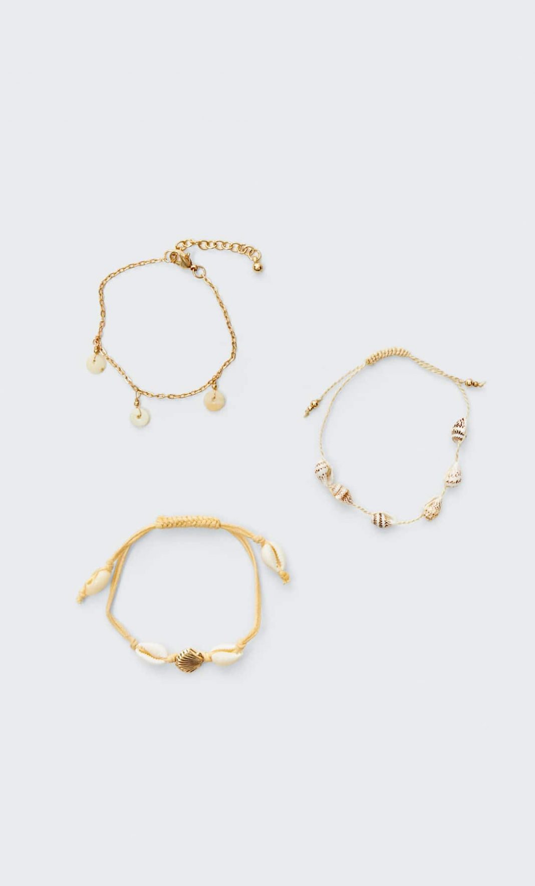 Las tres pulseras están adornadas con conchas y caracolas. Son sencillas y, a la vez, muy originales. Quedarán genial con un estilismo a base de shorts vaqueros y una bonita camiseta.