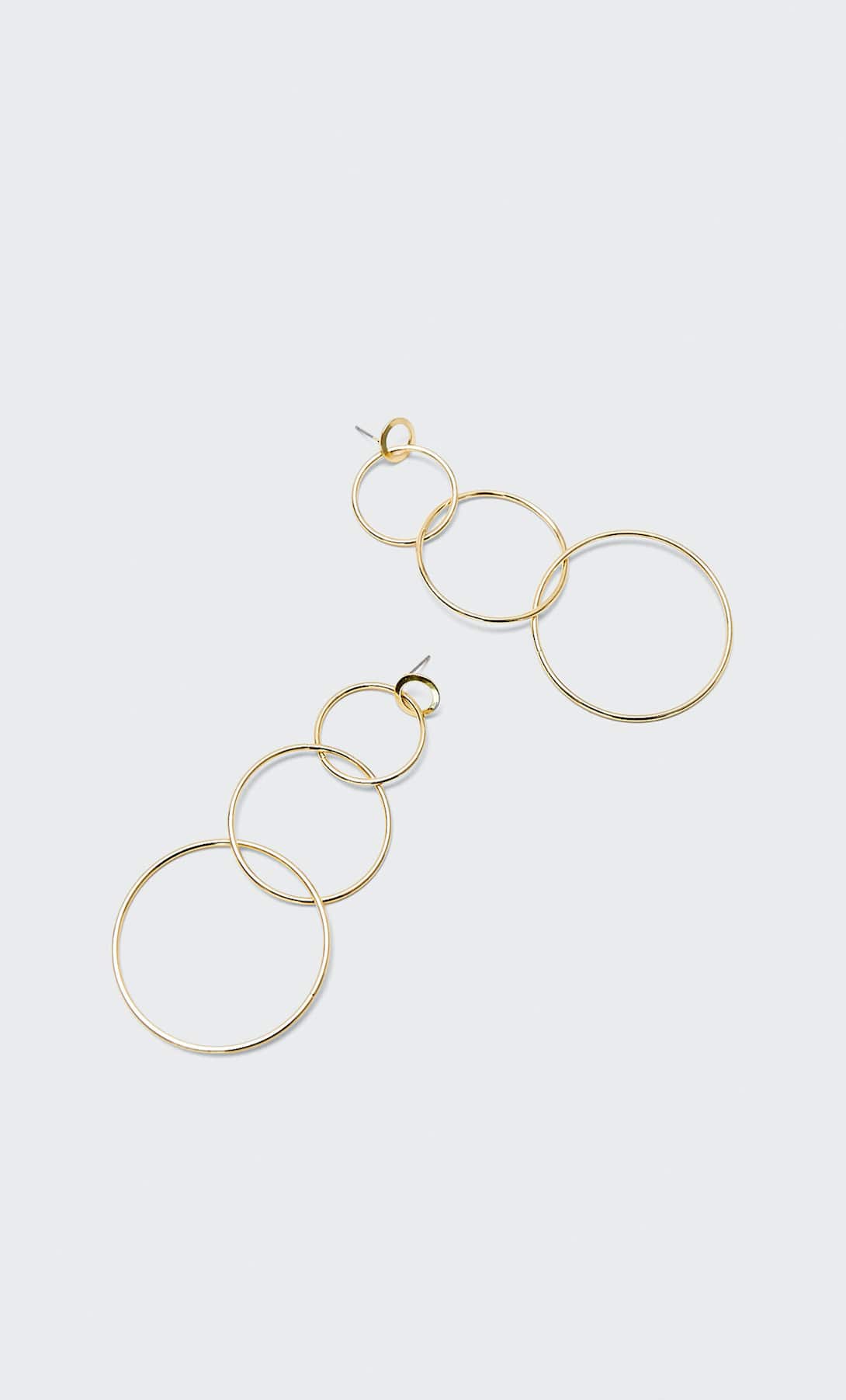 Se trata de un par de pendientes compuestos por tres aros enlazados entre sí. Empezando por el más pequeño y acabando por el más grande. Un diseño a la última que seguro que no te vas a querer quitar.