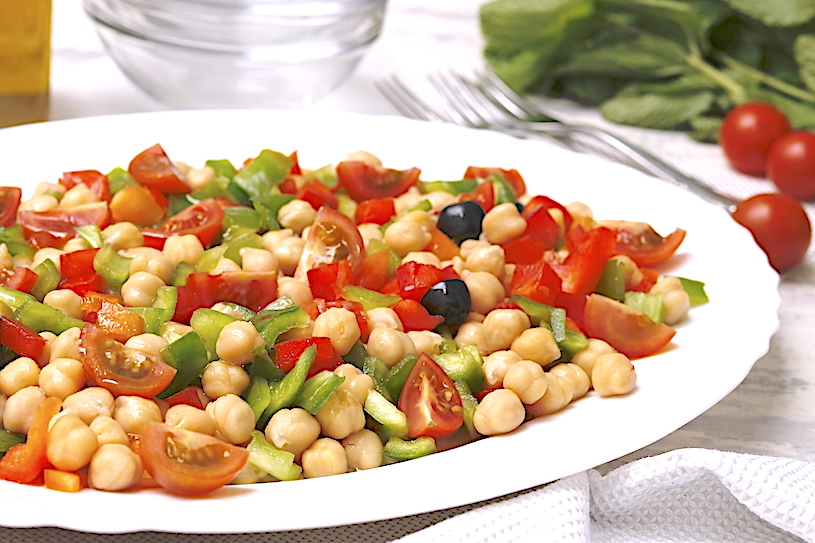 Para elaborar este plato solo necesitas mezclar los garbanzos con media cebolla, unos tomates cherry, pimiento rojo y verde, un poco de atún en aceite o al natural y unas aceitunas. Menos los garbanzos, pica bien todos los ingredientes.