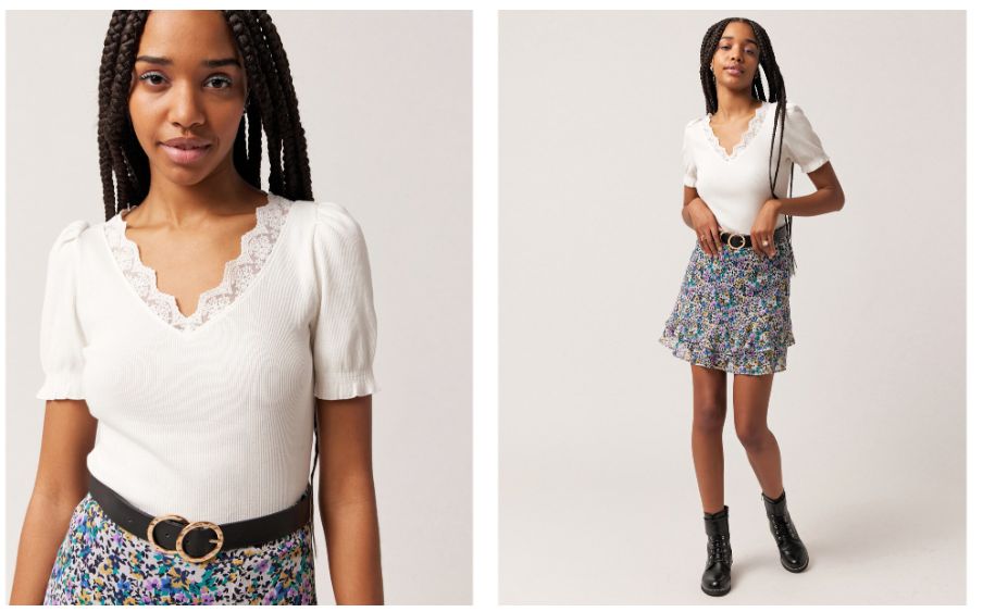 Veamos otra propuesta a la última en El Corte Inglés. Es un modelo Naf Naf, homewear de canalé y que pertenece a la nueva colección. Una opción ideal para la primavera y el verano, como ves perfecta para combinar con minifaldas pero también con pantalones largos o pirata. La tienes en blanco, negro, verde o coral y a un precio de 29,90 euros. Tiene escote pico con puntillas en cuello y espalda y volantes en las mangas. Casi enteramente hecha en algodón, en este enlace la tienes a dos clics.