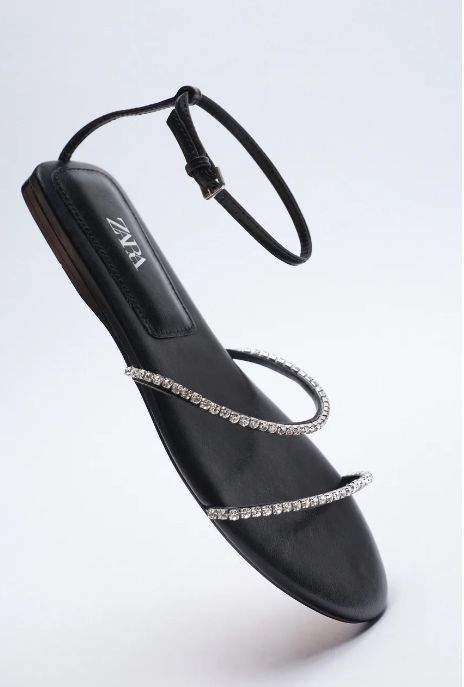 Todas las personas que se piensan que una sandalia es un tipo de calzada para utilizar de manera exclusiva en el día a día están muy equivocadas. Y es que también existen modelos muy elegantes para ponerse en grandes ocasiones. Como por ejemplo este que hemos visto en el catálogo de Zara. Se trata de unas sandalias que destacan, sobre todo, por tener unas tiras finas en el corte con varios brillos. Pero además también tienen un sistema de cierre mediante hebilla en pulsera envolvente a la altura del tobillo. Solo cuestan 15’99 euros.