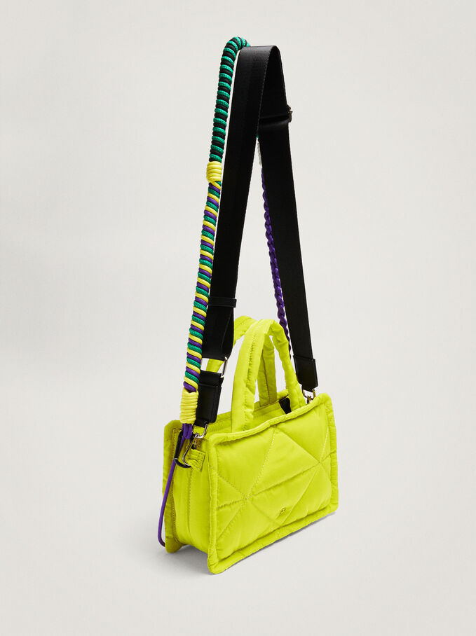 Es un bolso tote acolchado confeccionado en nailon, con cierre mediante cremallera y dos bolsillos interiores. Combina las asas de mano con un asa de hombro de cuerda multicolor. No puede ser más veraniego y juvenil.
