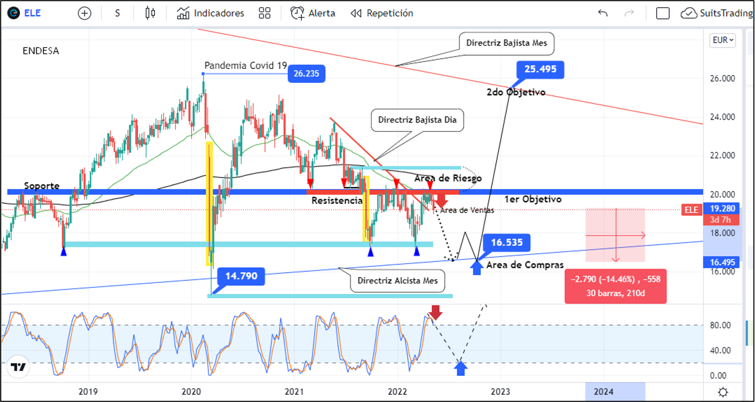 De esta forma, es muy probable que el precio vaya a buscar mínimos anteriores en inmediaciones de 17,2 euros los cuales son precios de referencia mínimo de octubre de 2018, de septiembre de 2021 y de marzo de este año. Adicional a ello, el precio en gráfico de marco mensual viene trabajando en la formación de un triángulo descendente que podría buscar soporte en el nivel inferior del triángulo en inmediaciones de 16,5 euros por acción, lo que representa una pérdida del valor del -14% antes de pensar en retomar el camino alcista.