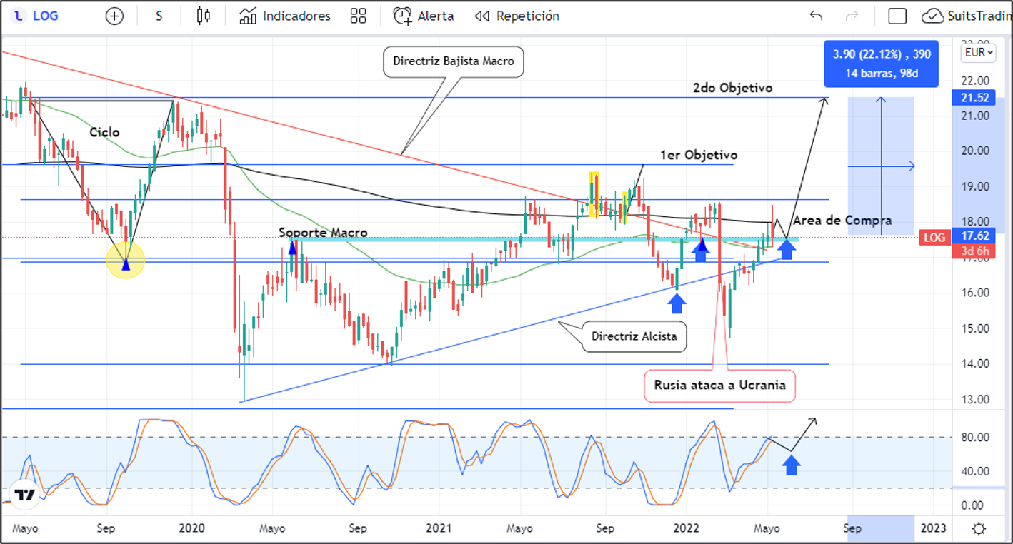 El precio se ha ubicado por encima de la media móvil exponencial de 50 periodos y trabajando sobre el soporte macro más importante que se registra en junio de 2020 arriba de 17,4 euros. Técnicamente en contra tiene la media móvil exponencial de 250 periodos la cual ha respetado con la publicación de los resultados pero que al mismo tiempo, nos indica que, si de cara a la apertura de la vela semanal de la próxima semana, respeta el soporte de los 17,5 euros, tendrá posibilidad de realizar la ruptura de la media móvil dando señal de compra ubicando un primer objetivo en el pulso del ciclo, es decir, en inmediaciones de 19,6 euros y un segundo objetivo como ya lo mencionamos, arriba de 21 euros lo que corresponde a entre un 10% y 20% de beneficio estimado a un mediano y largo plazo.