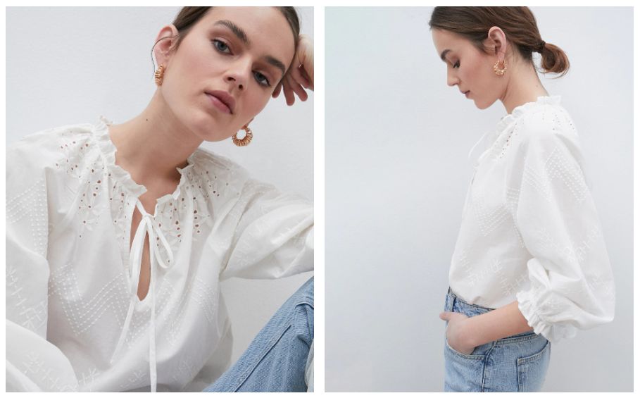 Seguimos con otra propuesta de blusa de Fórmula Joven y con un modelo con calados y lazada al cuello. También está disponible en color blanco y como ves es otra propuesta perfecta para el verano, para los días de más calor, para llevar a tus escapadas o vacaciones y lucir cómoda en terrazas, playa, montaña pero también para compromisos sociales. Hecha 100% en algodón, tiene manga larga, puños fruncidos y cuello caja con lazada y detalle de calados. Con el 30% se quedará en 27,99 euros y la puedes comprar aquí.