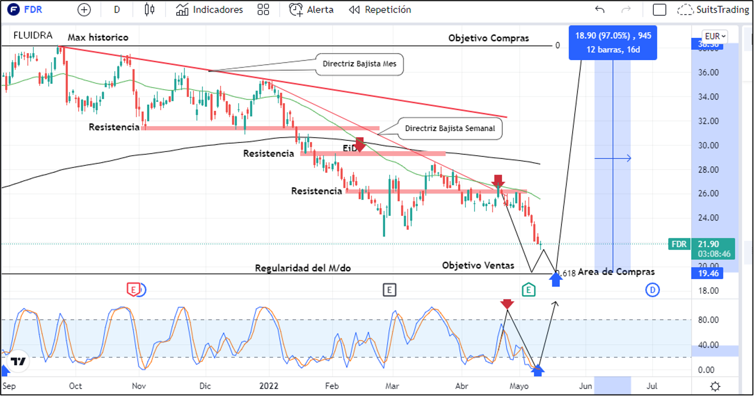 Repetimos nuevamente, estar muy atentos a la llegada a la regularidad del mercado en 19,5 euros desde donde compraremos las acciones de Fluidra al igual que la compañía misma en su interés de realizar recompra de acciones con lo cual buscaremos objetivos en los máximos históricos registrados en septiembre del año pasado arriba de 38 euros por acción lo que corresponde a un 100% de beneficio, movimiento que financiera y estructuralmente la compañía avala.