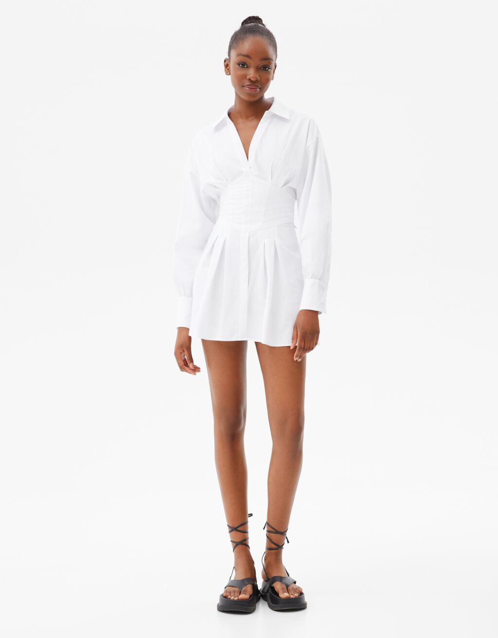 Vestido de popelín con diseño mini, ajustado en la zona de la cintura, con cuello solapa y manga larga acaba en puños con botones. Una prenda elegante que no pasa desapercibida.