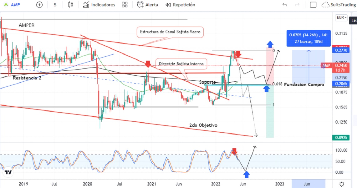 Si, por el contrario, el precio desarrolla la caída de manera rápida, muy probablemente realizará la ruptura del área de regularidad y del soporte en los 0,2045 euros que datan de septiembre de 2021 con lo cual, podría tomar impulso en busca del nivel inferior del canal bajista, lo que representa una pérdida de valor superior al -60%.