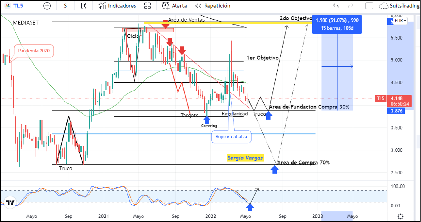 Tengamos presente que para confirmar que respeta dicha área, deberá realizar un movimiento de truco, es decir, V invertida tal cual los señalamos en la gráfica. Si por el contrario el gráfico semanal realiza la ruptura del área de regularidad, muy seguramente visitará los mínimos anteriores alcanzados por la pandemia en inmediaciones de 2,68 euros desde donde probablemente podríamos realizar una compra con un 70% en riesgo sobre la inversión en busca del objetivo planteado arriba del cierre de ciclo macro en inmediaciones de 5,7 euros. La fundación de compra representa una revalorización superior al 50% estimada a largo plazo o a corto, si es que Berlusconi mejora la oferta por Mediaset.