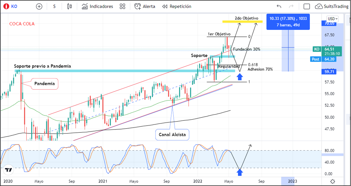 Técnicamente en gráfico de marco semanal la acción de Coca-Cola alcanzó sus máximos históricos el pasado 25 de abril registrando los 67,20 dólares por acción. Posterior a ese movimiento realizó un retroceso hasta el área de soporte del 25 de febrero previo al inicio de los ataques de Rusia contra Ucrania en inmediaciones de 62,9 dólares que, al mismo tiempo, confluye con la media móvil exponencial de 50 periodos de marco diario.