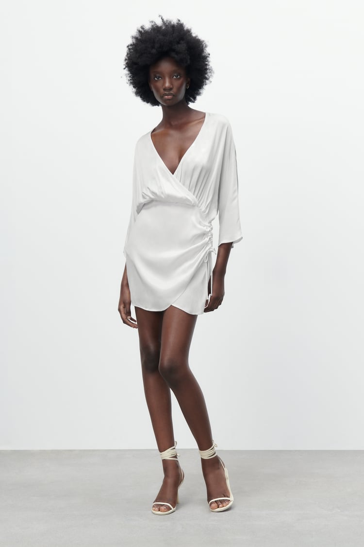 Vestido mini con escote de pico cruzado y manga que queda por debajo del codo. Con un original detalle de frunces en los laterales y cordones de ajuste. Perfecto para llevarlo con sandalias altas o bajas.