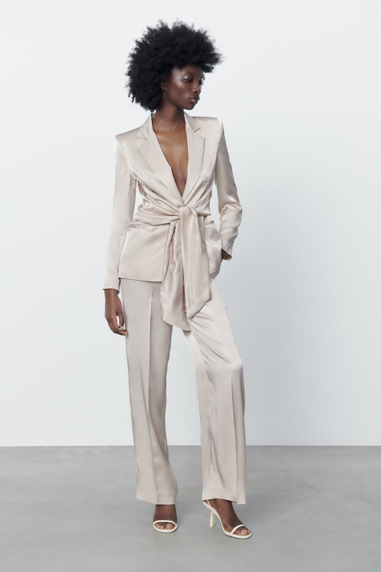 El tejido satinado es un must esta temporada, y en esta ocasión nos lo enocntramos en una blazer con un estilo muy femenino. Con cuello de solapa y manga larga. Con hombreras para un mejor ajuste.