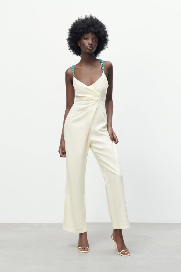 Es un mono confeccionado en lino, con escote cruzado, pernera recta, detalle de frunce en el pecho, y tirantes de tipo cadena en un llamativo color turquesa que resalta sobre el color crudo de la prenda.