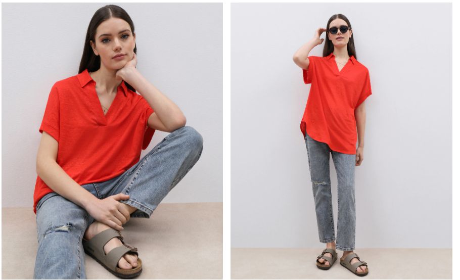 No abandonamos las camisetas con otro modelo top. Las camisetas tipo polo son un must que nunca pasará de moda. Fórmula Joven nos propone este diseño en 100% lino, de corte muy fluido y agradable, con cuello sin botones y amplias mangas.